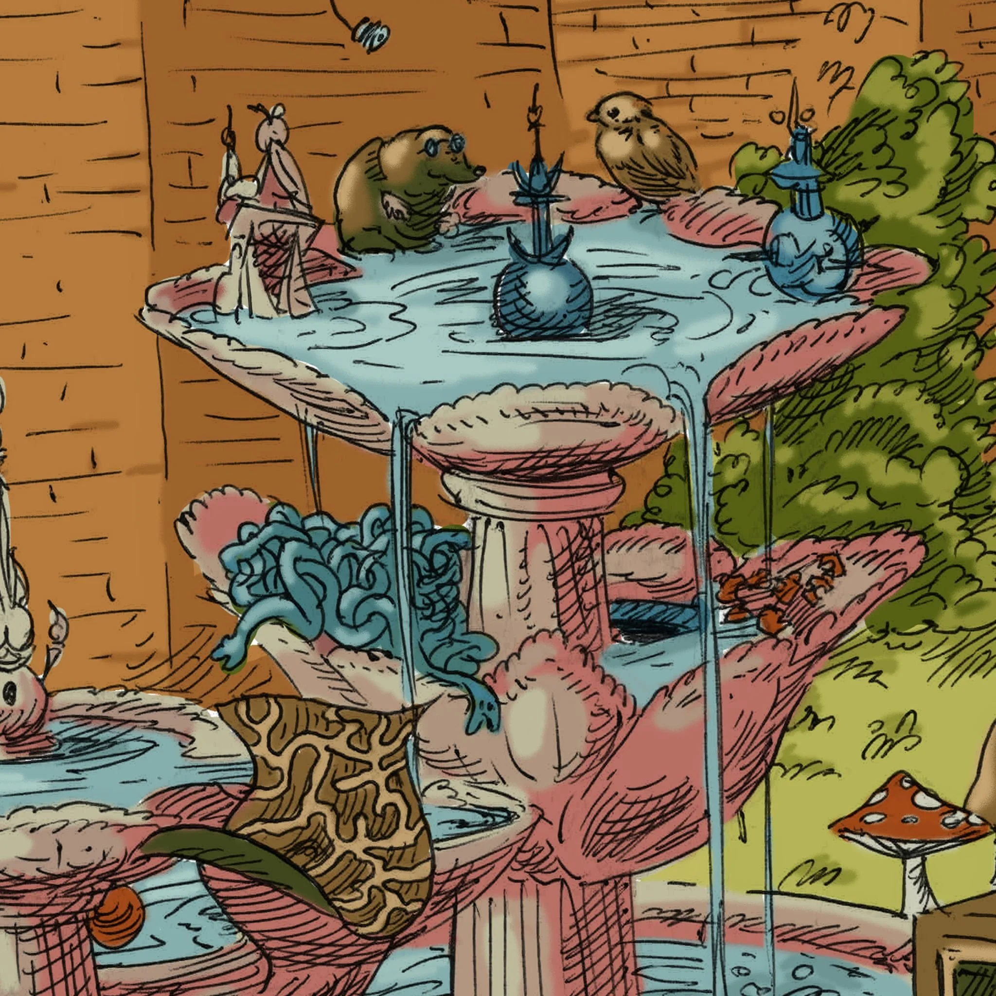 Ik had mijn gebruikelijke losse planning te volgen. Ijsbeerde weinig gemotiveerd in mijn kantoor. Ik herinnerde mij het molletje. Ik opende het raam. De mol had de poel bovenaan de fontein bereikt. Hij ruziede er met een mus. Beiden sloegen ze om beurten geïrriteerd in het water, gelijkaardig aan hoe filosofen met pruiken op hout slaan. Ik liet een stethoscoop zakken, tot net boven de stenen fontein, om hen af te luisteren.